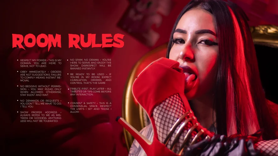 ペニバン, レザー, 寝取られ系, 下ネタ話, 足フェチ, 羞恥, ラテックス, 手コキ, ヒール, 女主人, スパンキング, エッチなダンス, ディルドまたはバイブ, 顔面騎乗位, ロールプレイ, オナニー指導, オナニー, パイズリ, ペニス評価, アヘ顔, ディープスロート, 大人のおもちゃ, フェラ, オーガズム, オイルショー, 潮吹き, トゥワーク