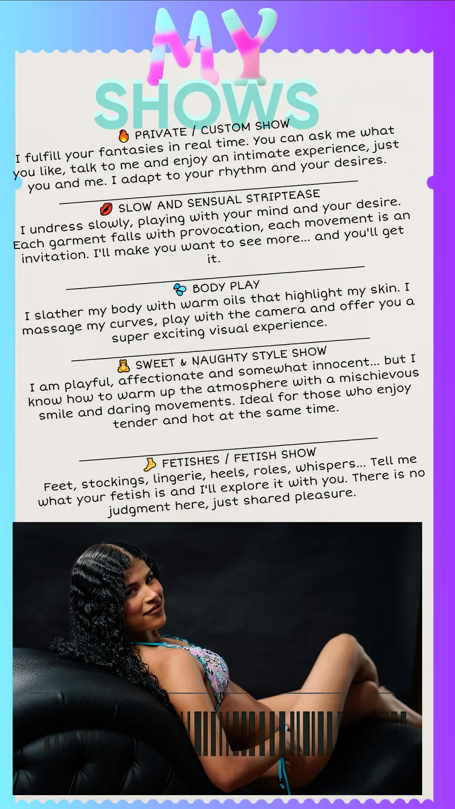 I’m 19, a young Latina with fire in my skin and a sparkle in my eyes. I’m a student, but I also know how to play with looks. I’m sensual, curious, intense… and when I let go, I can be as sweet as I am dangerous. I love to tease without saying a word.